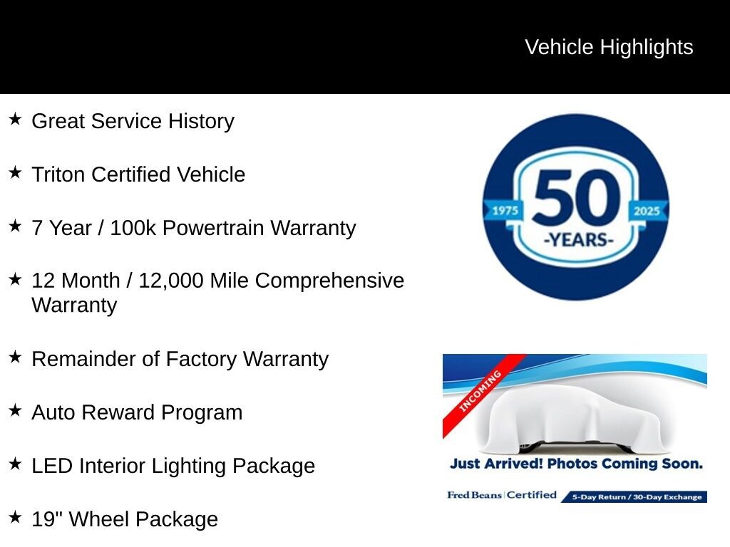 Certified. Certification Program Details: Triton Certified Shield • 7-Year or up to 100,000-Mile Powertrain Limited Warranty • 12-Month or 12,000-Mile Comprehensive Coverage ($100 deductible) • 100+ Multipoint Inspection • All Fluids Checked • Tires 6/32" or Better • 50% or Better brakes • Oil, Lube, & Filter Service Completed • PA State Inspection & Emissions Test • 5-Day Return Policy1 • 30-Day Exchange Policy2 • CARFAXTM Report • AutoRewards Membership • See salesperson for additional offers & complete details.