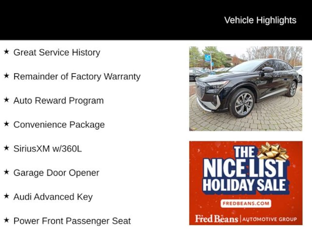 2024 Audi Q4 Sportback e-tron Premium quattro Electric Motor Single-Speed Automatic quattro 4D Sport Utility Mythos Black Metallic Great Service History, Remainder of Factory Warranty, Auto Reward Program, Alarm System w/Motion Sensor, Audi Advanced Key, Auto-Dimming Power Folding Exterior Mirrors, Auto-Dimming Rear-View Mirror, Convenience Package, Dual-Pane Acoustic Glass for Front Side Windows, Garage Door Opener, Hands-Free Power Tailgate, Memory for Driver's Seat, Power Front Passenger Seat, Projection Light in Exterior Mirrors, SiriusXM w/360L, Wireless Phone Charging Pad.