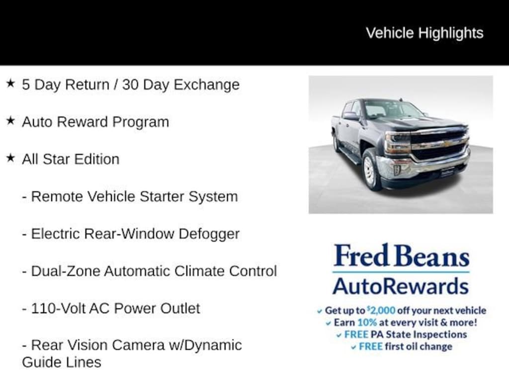 Experience the perfect balance of power, capability, and comfort with this 2016 Chevrolet Silverado 1500 LT LT1. This rugged and refined pickup is ready to take on any challenge, whether you're hauling heavy loads or embarking on your next adventure.- 5 Day Return / 30 Day Exchange- Auto Reward Program- Seating, Heated Driver and Front Passenger- EcoTec3 5.3L V8 Engine with Active Fuel Management and Variable Valve Timing- Steering Column, Manual Tilt and Telescoping- All Star Edition- Trailering Package- Dual-Zone Automatic Climate Control- Electric Rear-Window Defogger- 110-Volt AC Power Outlet- Remote Vehicle Starter System- Thin Profile LED Fog Lamps- Rear Vision Camera with Dynamic Guide LinesThis Silverado's impressive 5.3L V8 engine delivers exceptional power and performance, with over 300 lb-ft of torque available from 2,000 to 5,600 rpm. The 6-speed automatic transmission with overdrive ensures smooth, efficient operation, while the 4WD system provides the traction and capability you need to conquer any terrain.Inside, the Silverado's spacious and well-appointed cabin offers a premium driving experience. The All Star Edition package includes features like dual-zone automatic climate control, a remote vehicle starter system, and a rear vision camera with dynamic guide lines, making every journey more comfortable and convenient.Whether you're towing a trailer, navigating tight spaces, or simply enjoying the open road, this Silverado is up to the task. The available trailering package, with its heavy-duty rear locking differential and auxiliary external transmission oil cooler, provides the confidence and capability you need to haul your toys with ease.Discover the perfect blend of power, utility, and refinement in this 2016 Chevrolet Silverado 1500 LT LT1. Visit our showroom today and experience the difference for yourself. We're confident this Silverado will exceed your expectations and become the trusted companion you've been searching for.