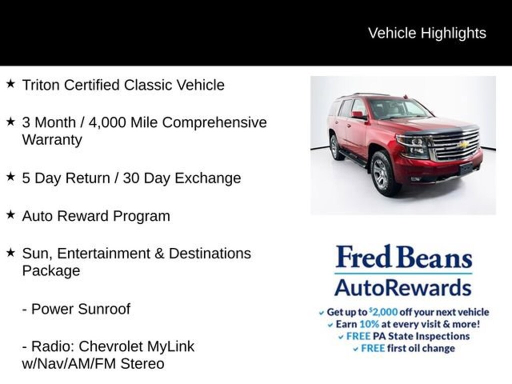 This Tahoe has been meticulously maintained and is Triton Certified, meaning it has undergone a comprehensive 172-point inspection and comes with a 3-month/4,000-mile comprehensive warranty. With low mileage of just 110,591, this SUV is ready to provide years of reliable service.