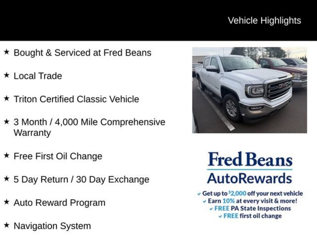 Discover the perfect blend of power, capability, and comfort in this 2018 GMC Sierra 1500 SLE. With its rugged 5.3L EcoTec3 V8 engine and 4-wheel drive system, this Sierra is ready to handle any task you throw its way. From hauling heavy loads to navigating challenging terrain, this truck delivers exceptional performance and versatility. Bought & Serviced at Fred Beans Local Trade Triton Certified Classic Vehicle 3 Month / 4,000 Mile Comprehensive Warranty Free First Oil Change 5 Day Return / 30 Day Exchange Auto Reward Program SLE Value Package Trailering EquipmentThe Sierra's impressive list of features doesn't stop there. Enjoy the convenience of the SLE Convenience Package, which includes power-adjustable pedals, rear park assist, rear window defogger, and a sliding rear window. Stay connected with the GMC Infotainment System, complete with SiriusXM Satellite Radio, HD Radio, and a premium audio system. Maintain your comfort with dual-zone automatic climate control, a heated steering wheel, and a 10-way power driver's seat.This Sierra 1500 SLE is also Triton Certified, meaning it has undergone a rigorous inspection and reconditioning process to ensure it meets the highest standards of quality and reliability. With a 3-month/4,000-mile comprehensive warranty and a free first oil change, you can drive with confidence knowing this truck is ready to serve you for years to come.The Sierra's impressive capabilities are matched by its refined and modern styling. The white exterior is complemented by chrome accents, LED fog lamps, and 17-inch bright machined aluminum wheels, giving this truck a bold and distinctive presence on the road.Whether you're tackling tough jobs or embarking on weekend adventures, this 2018 GMC Sierra 1500 SLE is the perfect companion. Experience the perfect blend of power, technology, and comfort that this exceptional truck has to offer. Visit our showroom today and let us demonstrate how this Sierra can exceed your expectations.
