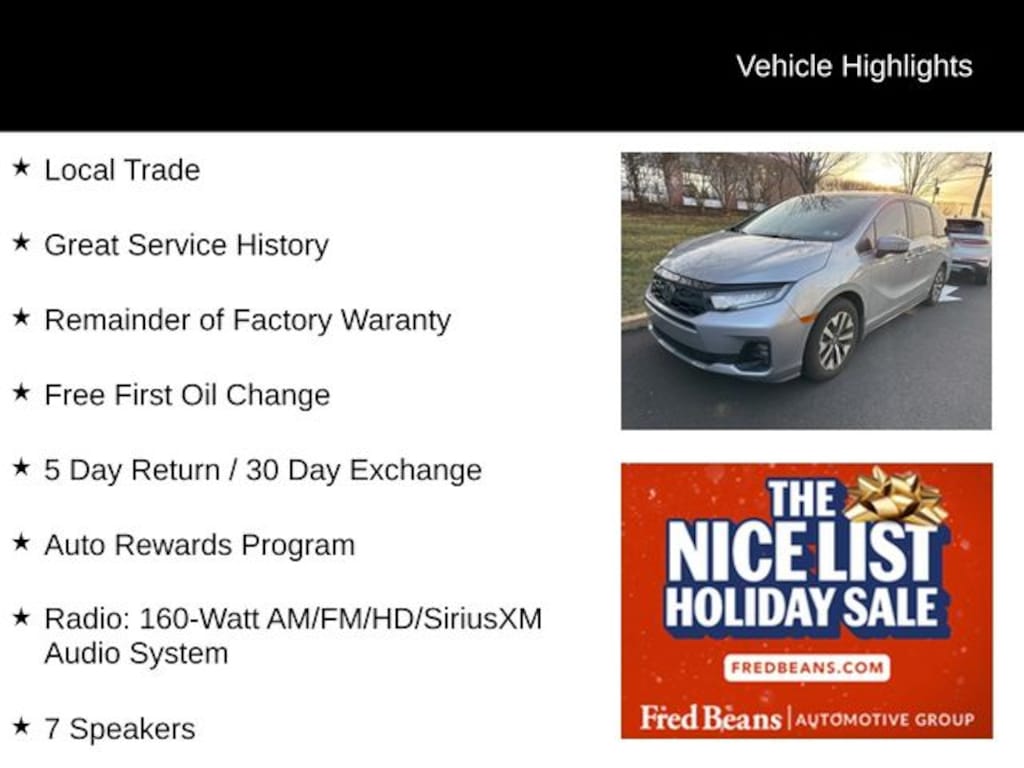 This 2025 Honda Odyssey EX-L blends family-friendly versatility with premium comfort and modern technology, all wrapped in a sleek Solar Silver Metallic finish. Powered by a proven 3.5L V6 paired with a smooth 10-speed automatic transmission and front-wheel drive, this Odyssey delivers confident performance and everyday drivability. It is a local trade with a strong service history and includes the remainder of the factory warranty, along with a CARFAX One-Owner and Clean CARFAX for added peace of mind.