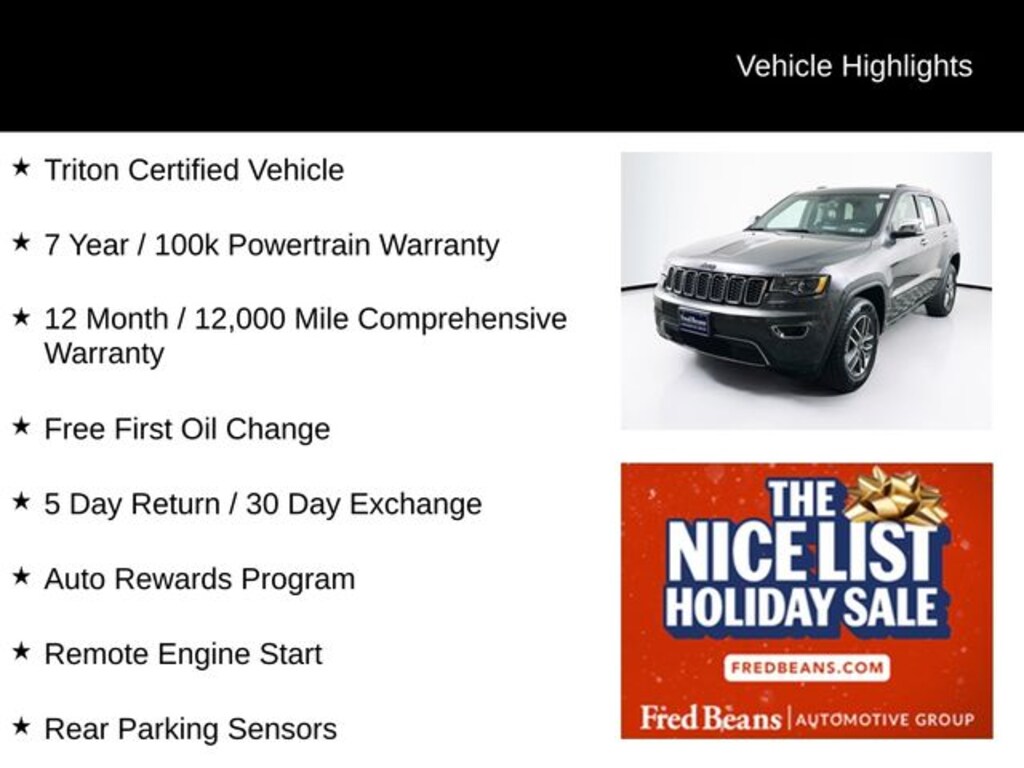 This 2021 Jeep Grand Cherokee Limited comes finished in Granite Crystal Metallic Clearcoat and is powered by a 3.6L V6 paired with an 8-speed automatic transmission and 4WD. This Triton Certified vehicle includes a 7 year or 100,000 mile powertrain warranty, a 12 month or 12,000 mile comprehensive warranty, a free first oil change, a 5 day return and 30 day exchange program, and access to our Auto Rewards Program. It is equipped with remote engine start, rear parking sensors, blind spot monitoring with rear traffic alert, a 1-year SiriusXM Guardian trial, a 4G LTE Wi-Fi hotspot, an 8.4 inch touchscreen display, Apple CarPlay and Android Auto, automatic temperature control, front dual-zone A/C, fully automatic headlights, HD Radio, GPS navigation, heated front seats, a heated steering wheel, leather-trimmed bucket seats, integrated Bluetooth voice command, a memory driverâs seat, ParkView rear back-up camera, a power driver seat, power liftgate, power moonroof, the Quick Order Package 2GH, Uconnect 4C NAV with 8.4 inch display, SiriusXM Satellite Radio with Traffic Plus and Travel Link, and 18 inch Tech Gray Diamond Cut wheels.