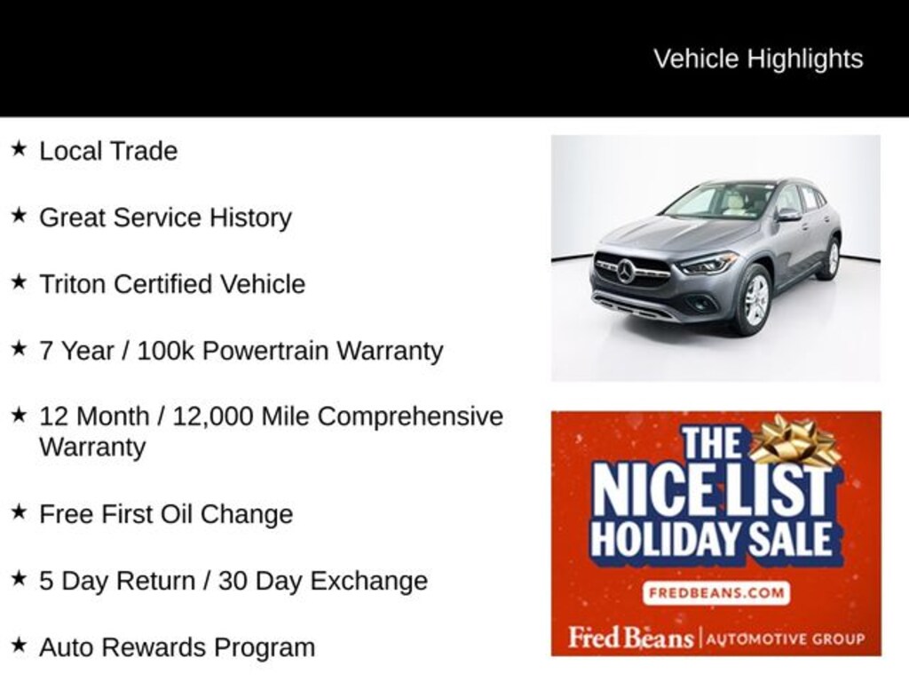 This GLA 250 is Triton Certified, giving you added peace of mind with a 7-year or 100,000-mile powertrain warranty and a 12-month or 12,000-mile comprehensive warranty. Youâll also enjoy a free first oil change, our 5-day return and 30-day exchange policy, and enrollment in the Fred Beans Auto Rewards Program, where you can receive free Pennsylvania state inspections, local merchant discounts, and earn up to $2,000 toward your next vehicle just by servicing with us. Every used vehicle undergoes a thorough 127-point inspection, because at Fred Beans, our used cars are better, and our reputation depends on it.