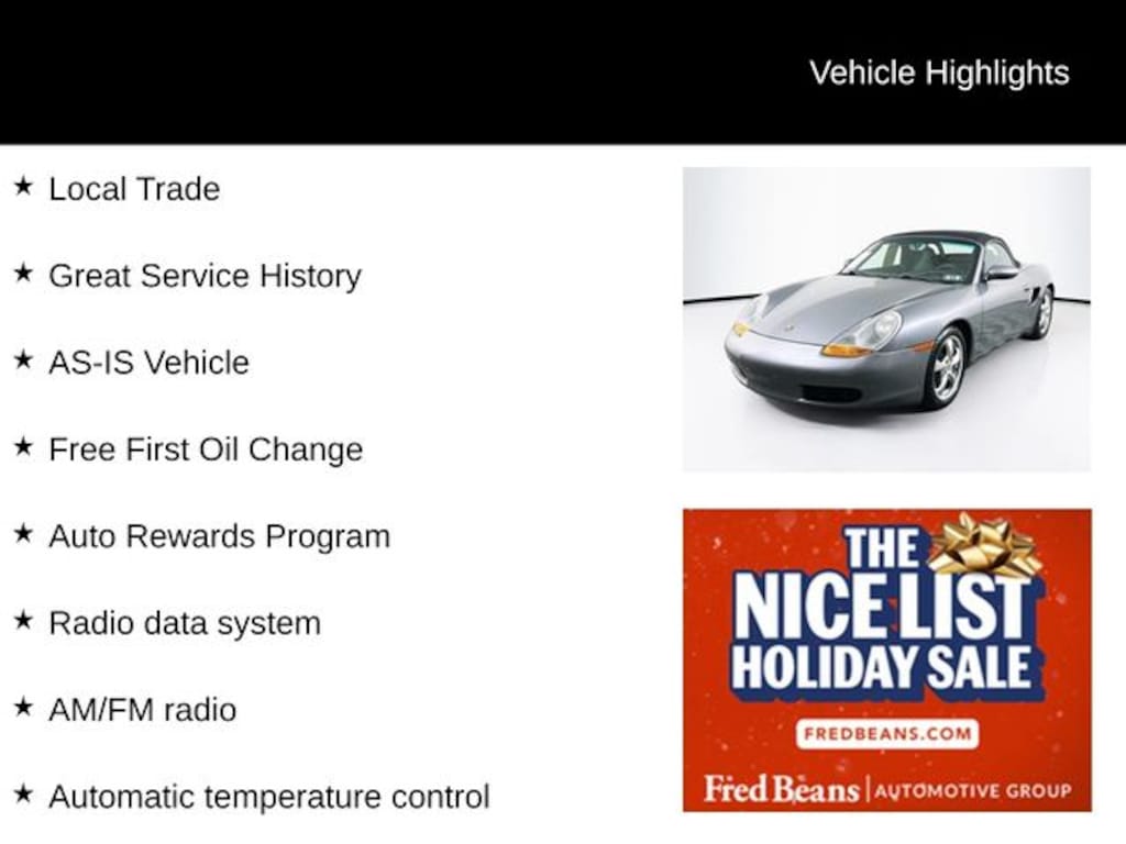 2001 Porsche Boxster Base 2.7L H6 SMPI DOHC 5-Speed Automatic with Tiptronic S RWD 2D Convertible Gray Local Trade, Great Service History, AS-IS Vehicle, Free First Oil Change, Auto Rewards Program, Alloy wheels, AM/FM radio, Automatic temperature control, Convertible roof lining, Four wheel independent suspension, Front fog lights, Heated door mirrors, Leather Shift Knob, Leather steering wheel, Power convertible roof, Power door mirrors, Power driver seat, Power passenger seat, Radio data system.