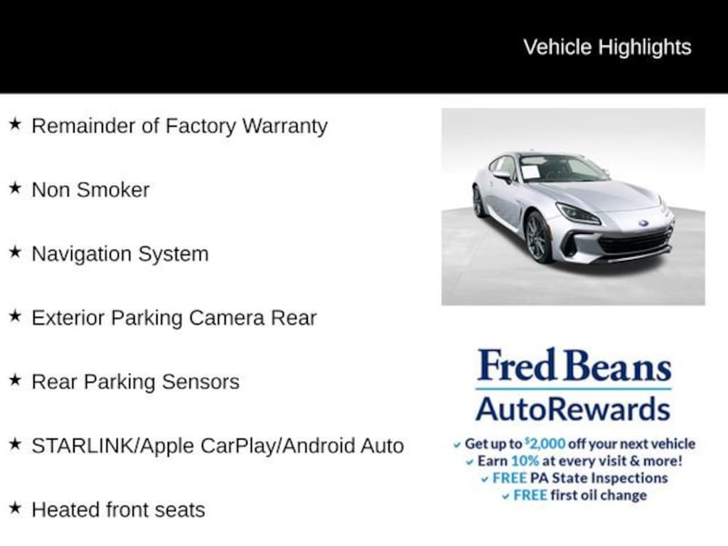 Beyond the exceptional performance, this BRZ Limited is packed with a wealth of premium features that elevate the driving experience. Enjoy the convenience of dual-zone automatic climate control, the connectivity of STARLINK infotainment with Apple CarPlay and Android Auto, and the added safety of advanced driver-assistance technologies like the Rear Parking Sensors and Lane Departure Warning System.