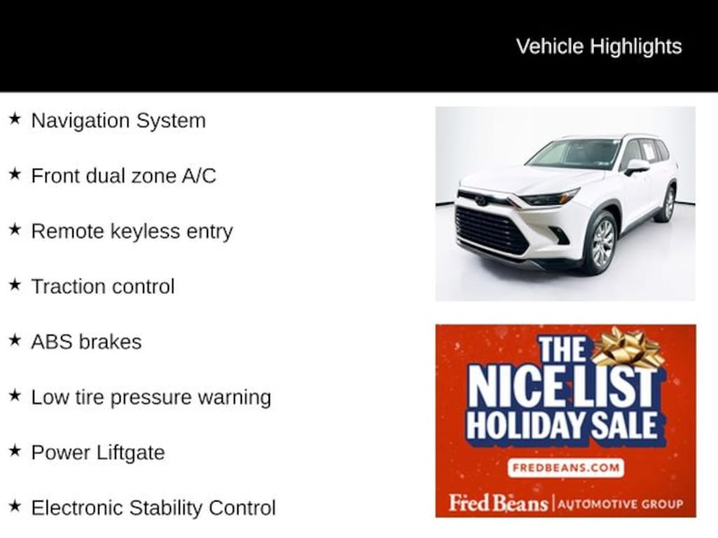 2024 Toyota Grand Highlander Limited 2.4L 4-Cylinder 8-Speed Automatic AWD 4D Sport Utility Wind Chill Pearl 20" Aluminum Alloy Wheels, ABS brakes, Active Cruise Control, Alloy wheels, Electronic Stability Control, Front dual zone A/C, Heated door mirrors, Heated front seats, Heated rear seats, Illuminated entry, Leather Seat Trim, Low tire pressure warning, Navigation System, Power Liftgate, Remote keyless entry, Traction control.